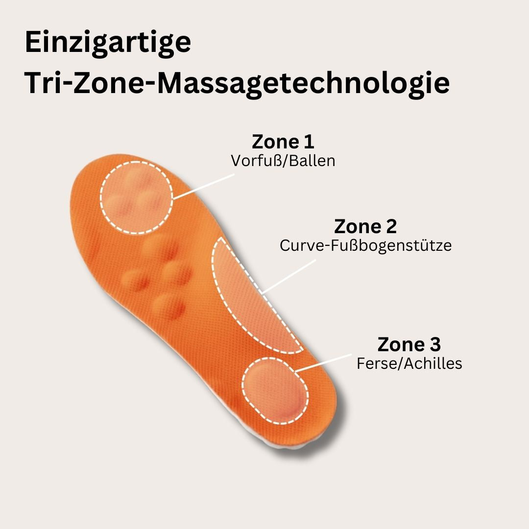 Die aktive Dämpfung durch die Tri-Zone-Massagetechnologie mit dem eingelassenen Fersenpolster, hält Deinen Fuß gerade und stützt ihn zuverlässig.